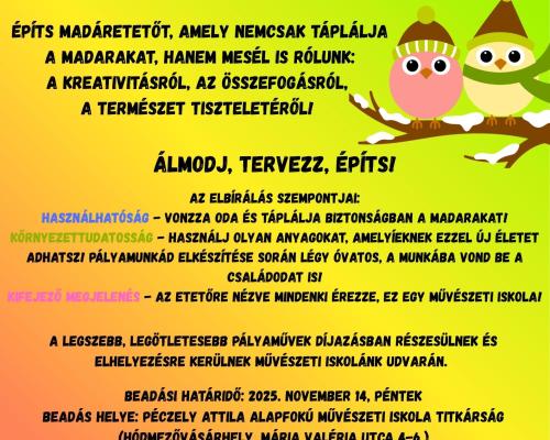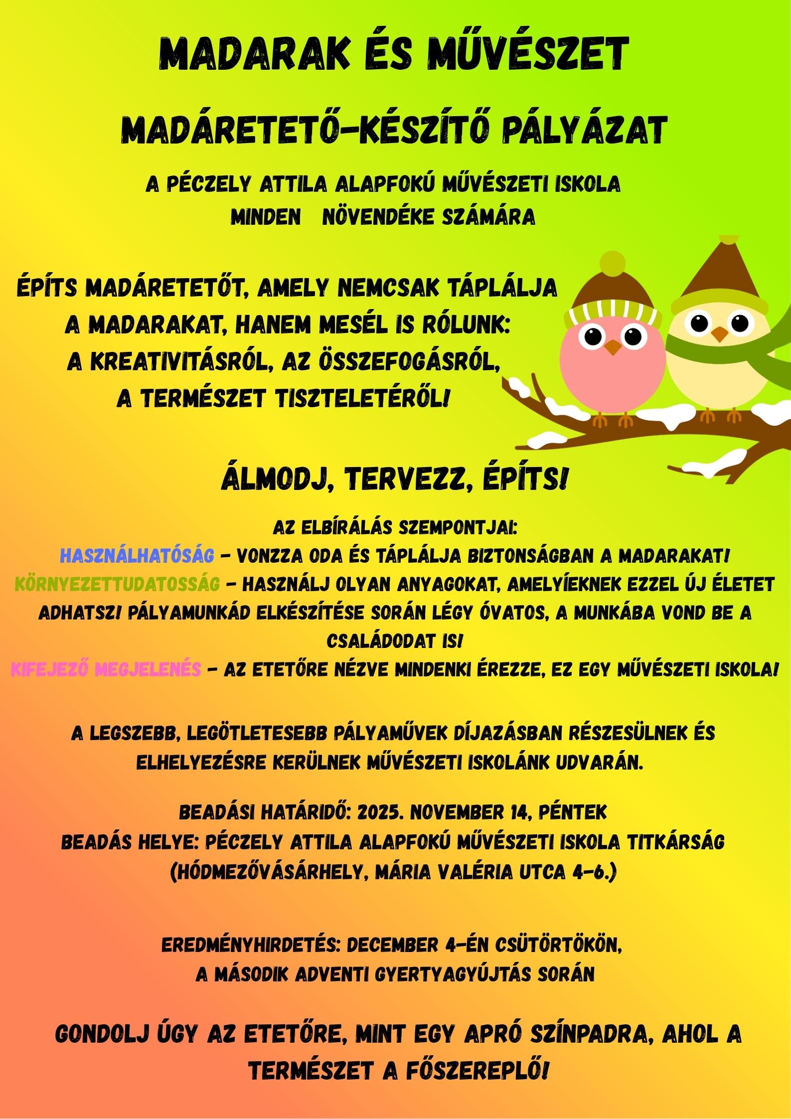 MADÁRETETŐ-KÉSZÍTŐ PÁLYÁZAT Növendékhangverseny Növendékhangverseny Péczely Pódium Gratuláció Pótfelvételi Órabeosztás 2025/2026-os tanév Felvételt nyert tanulók (2025-2026-os tanév) Nyári ügyelet 2025 Tanévzáró 2025 Oldalak1 2 3 következő › utolsó »